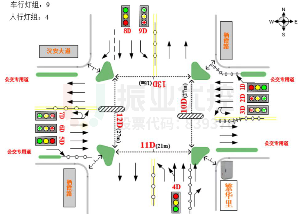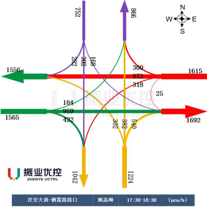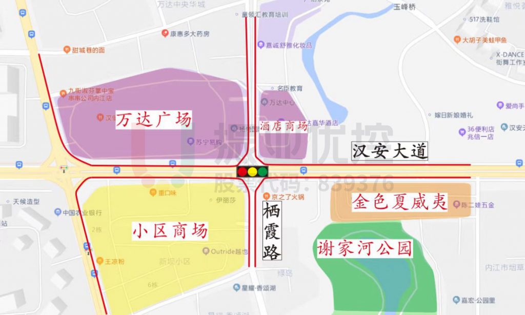 漢安大道與棲霞路交叉口(十字)位于內(nèi)江市東興區(qū)萬(wàn)達(dá)廣場(chǎng)東南側(cè),由東西走向的漢安大道(雙向8車(chē)道)以及南北走向的棲霞路(雙向4車(chē)道)交叉組成。周邊分布有萬(wàn)達(dá)廣場(chǎng)、金色夏威夷、謝家河公園及其它居民小區(qū)、酒店、商場(chǎng),是機(jī)動(dòng)車(chē)、非機(jī)動(dòng)車(chē)及行人過(guò)街主要匯聚點(diǎn)。