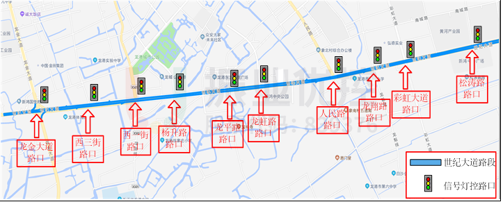 世紀(jì)大道為龍港市東西走向城市主干道之一,西接龍金大道,東接新城區(qū)域,承載市區(qū)進(jìn)出城方向的主要交通流。路段全長5.6公里,沿途分布10個紅綠燈路口。該路段沿線分布眾多住宅區(qū)、學(xué)校、工業(yè)園區(qū)等,市民日常出行需求及貨運(yùn)需求大,道路通行壓力較大。