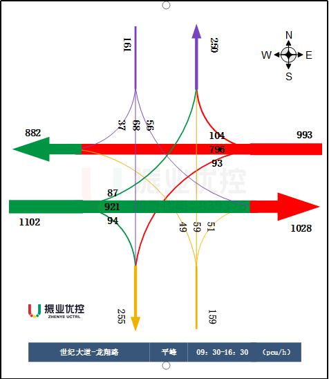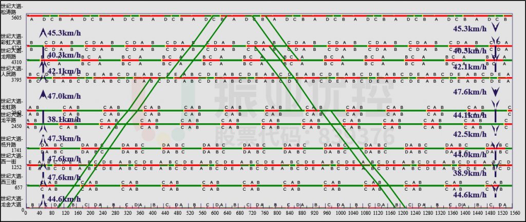 由于該路段車流量大,車型種類豐富導(dǎo)致整體通行速度較低,通行效率不高。故對世紀(jì)大道設(shè)計平峰時段綠路協(xié)調(diào)控制方案,提高通行效率,提升行車體驗(yàn)感。