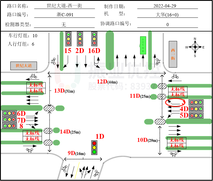 考慮到世紀(jì)大道沿線相鄰路口間距離較短、東西直行流量大、貨車占比大、各路口周期差異化嚴(yán)重等特點(diǎn),為減少停車次數(shù),減少貨車等車輛的啟動損失時間,提高路口通行效率,龍港交警大隊與交通工程師計劃對世紀(jì)大道設(shè)計平峰時段雙向綠路協(xié)調(diào)控制,做到路段少停車甚至不停車來提高路段平均車速,進(jìn)而提升路段通行效率。