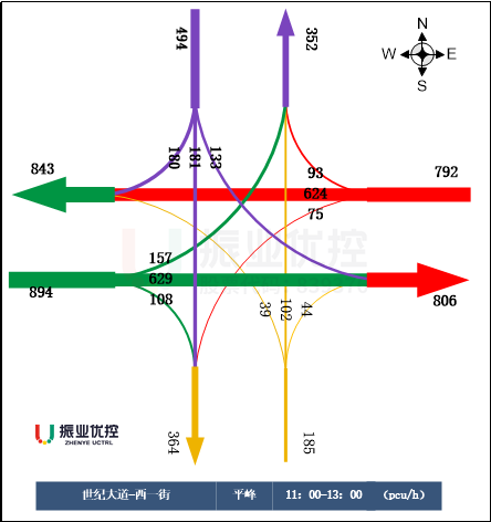 世紀(jì)大道平峰時段東西方向車流主體以直行為主,右轉(zhuǎn)車輛占比較少,導(dǎo)致右轉(zhuǎn)車道利用度低,路口通行效率不高。
