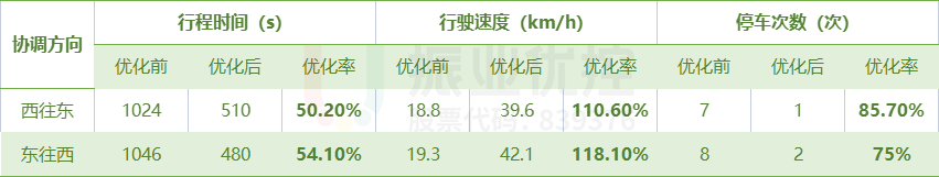 優(yōu)化后,平峰時段(9:00-16:30分)世紀(jì)大道西往東優(yōu)化前行程時間為17分04秒,優(yōu)化后行程時間為8分30秒;東往西優(yōu)化前行程時間為17分26秒,優(yōu)化后行程時間為8分鐘,通行效率平均提高52.2%,雙向總停車次數(shù)由15次降為3次。