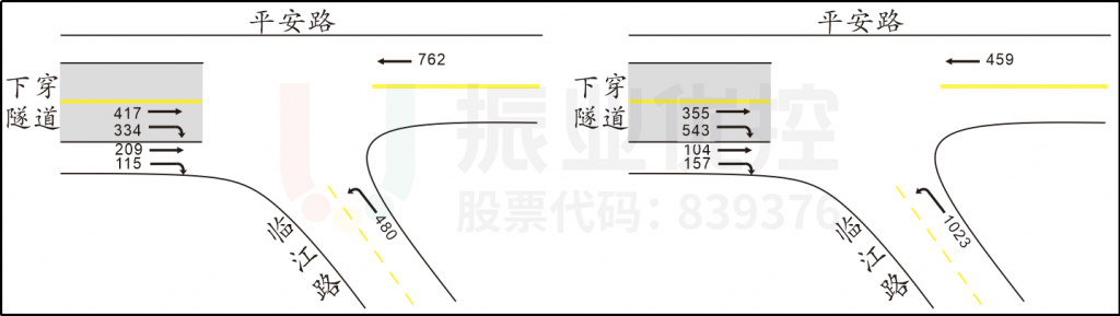 路口西側(cè)進出口為下穿隧道與輔路,早晚高峰時段承載交通壓力較大;南側(cè)(臨江路)進口為單車道,早晚高峰時段匯流車流排隊擁堵現(xiàn)象明顯;(平安路)東進口方向通行較為順暢。