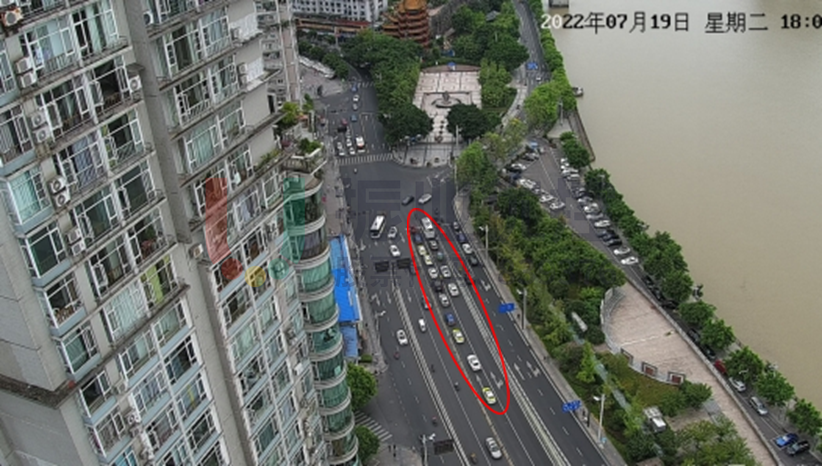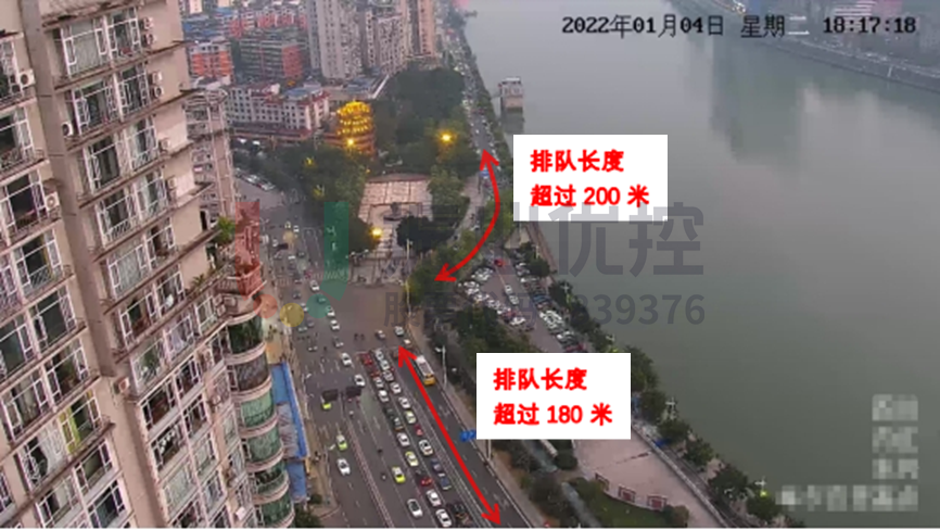 路口擁堵集中在早高峰(7:30-9:00)及晚高峰(17:30-19:00)西進口進隧道方向以及南進口方向,南進口僅一條直左車道,排隊較長。此外,南出口(臨江路)路側(cè)有停車泊位占道,影響車輛通行。