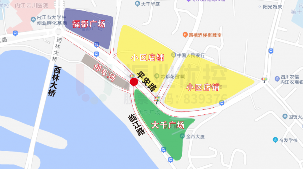 平安路與臨江路路口位于內(nèi)江市東興區(qū)西林大橋東北側(cè),由東西走向的平安路(西進出口雙向8車道,東進出口雙向5車道)與南北走向的臨江路(雙向2車道)交叉組成,周邊分布有大千廣場、福都廣場、居民小區(qū)、酒店、商場等,是機動車、非機動車及行人過街主要匯聚點。