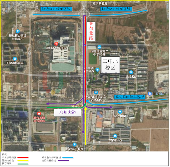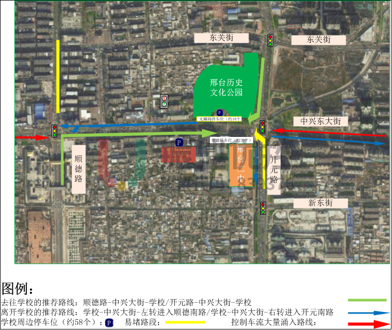 邢臺二中(南校區(qū))位于中興大街-開元路路口西南角,雙向六車道,道路條件較好。開學期間,大量接送車輛涌入中興大街(順德路至開元路),且臨時停車較多。