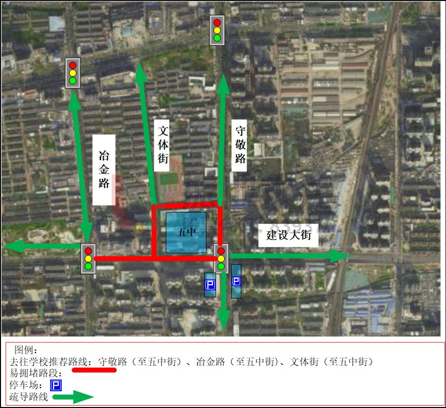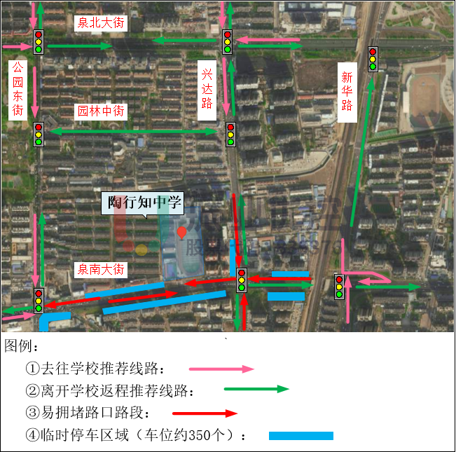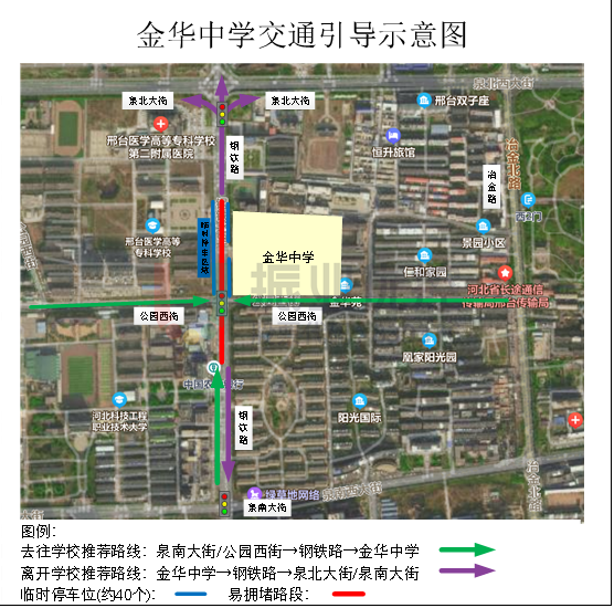 開學預案采用“緩進快出”控制策略,主要對公園西街-鋼鐵路路口方案進行調(diào)整,增加南北放行時間;在路口及學校安排警力疏導,引導車輛即停即走;值班人員及時調(diào)整根據(jù)路口運行情況,配合現(xiàn)場民警疏導車流,防止車流回溢。以下為金華中學交通引導示意圖。