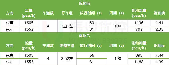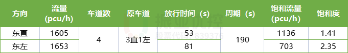 根據(jù)東進口出城方向早晚高峰流量分析,晚高峰時段出城車流較大,左轉(zhuǎn)一條車道飽和度達到2.35。通過重新規(guī)劃道路標(biāo)線,東進口由原三直一左車道調(diào)整為兩直兩左車道,提高左轉(zhuǎn)車輛通行效率。