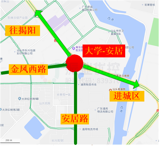 大學(xué)-安居路口位于汕頭市金平區(qū)大學(xué)路與安居路交匯處,其中大學(xué)路為東西向主干道,西接揭陽市,東通往汕頭城區(qū),是進出市區(qū)的必經(jīng)之路。