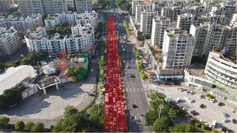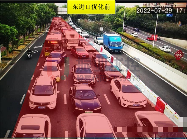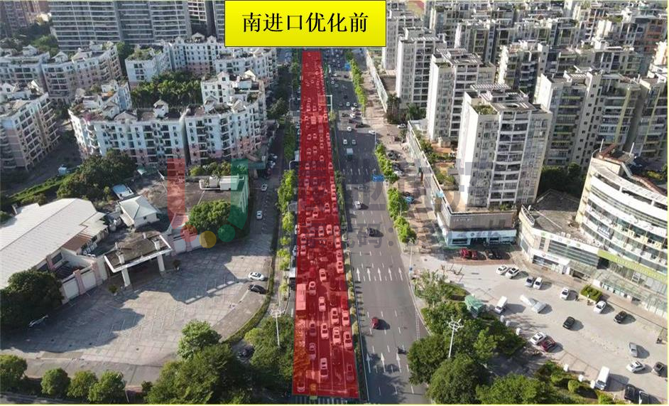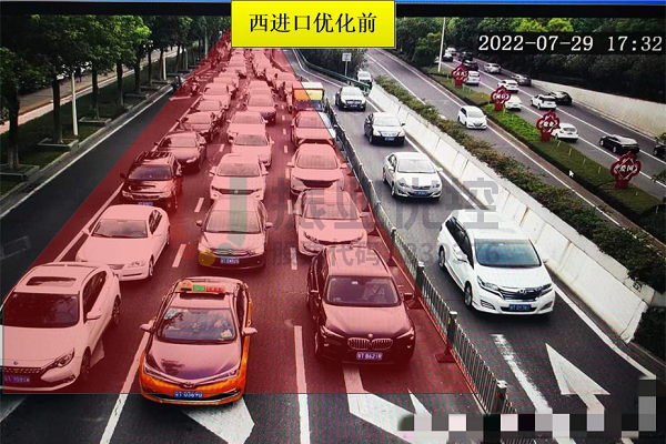設(shè)置“全方向待行區(qū)”后,有效縮短了各方向車流排隊(duì)長度,以南進(jìn)口為例,車輛排隊(duì)長度由優(yōu)化前的300米左右縮短至160米左右(如圖所示);東、西進(jìn)口高峰期排隊(duì)也有明顯改善。具體如下圖所示: