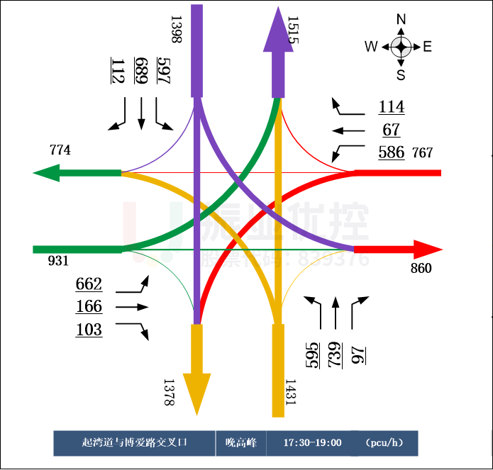 高峰時(shí)段,南進(jìn)口、東進(jìn)口、西進(jìn)口車流量較大,車輛排隊(duì)現(xiàn)象嚴(yán)重,排隊(duì)長度均在100米以上。