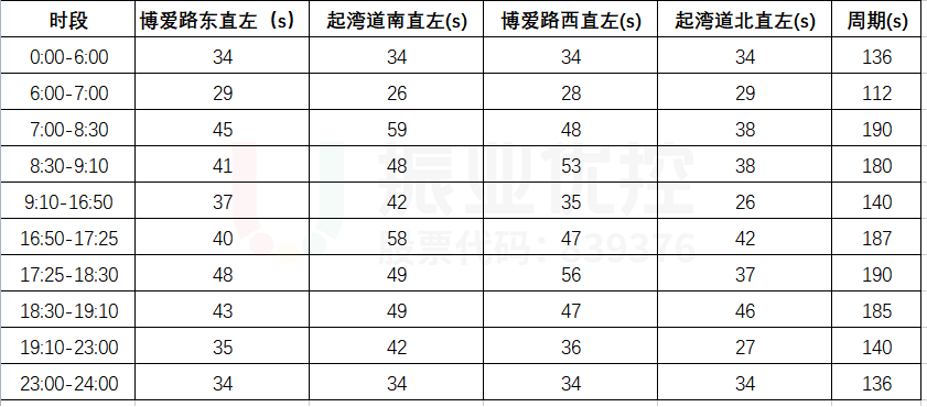 針對早、晚高峰期交叉口配時(shí)不合理問題,結(jié)合現(xiàn)場調(diào)研及互聯(lián)網(wǎng)大數(shù)據(jù)分析,對交叉口高峰時(shí)段、配時(shí)進(jìn)行精細(xì)化調(diào)整,壓縮交叉口周期,減少機(jī)動(dòng)車等待時(shí)間,降低交叉口延誤指數(shù)(如下表所示)。同時(shí)對上一相位的尾車與下一相位的頭車進(jìn)行分析,確保每個(gè)方向精確到秒地設(shè)計(jì)安全過渡時(shí)間,保障待行區(qū)的安全性。