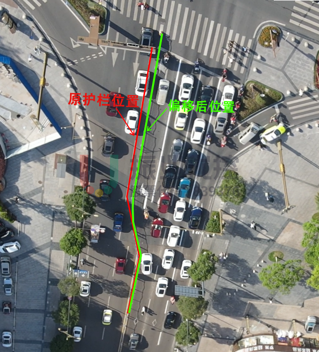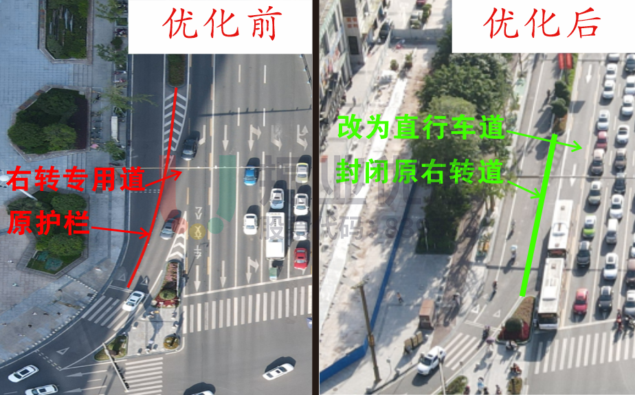 將西進(jìn)口主路最右側(cè)車道改為直行車道,采用隔離護(hù)欄封閉現(xiàn)有右轉(zhuǎn)區(qū),更改進(jìn)口道標(biāo)線。