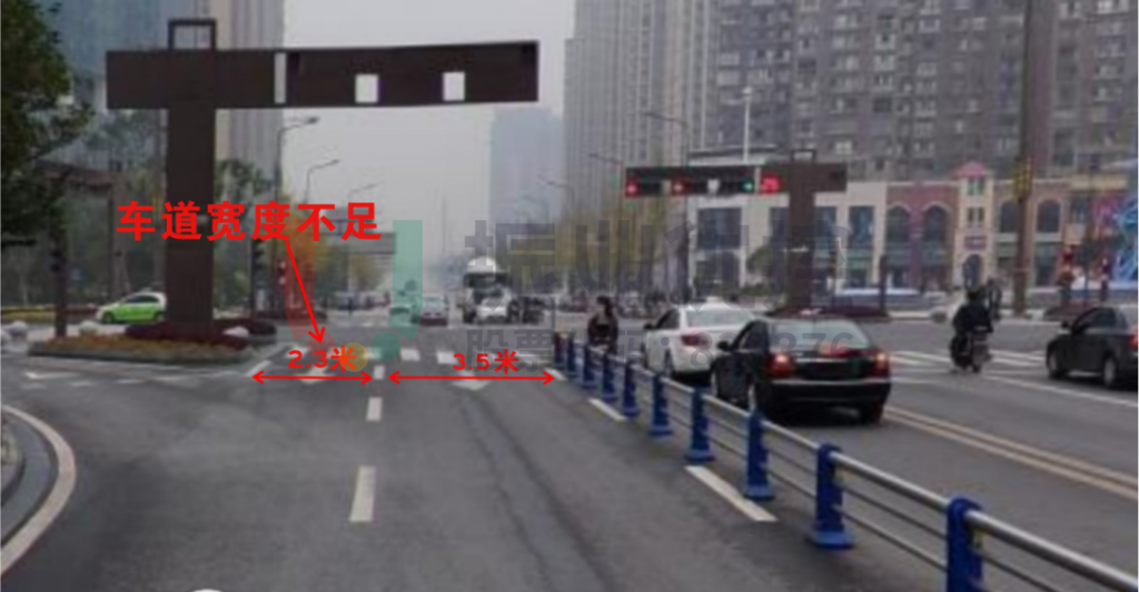 原南出口道2條車道寬度分別為3.5米和2.3米,出口不暢。將中央隔離欄向進(jìn)口道方向偏移50厘米,增大出口道寬度,便于尾車盡快通過路口。