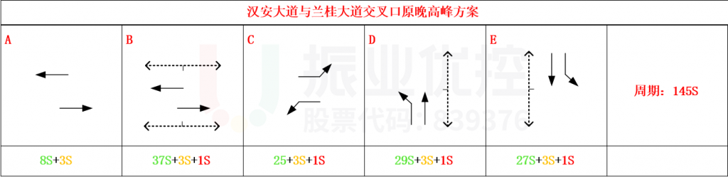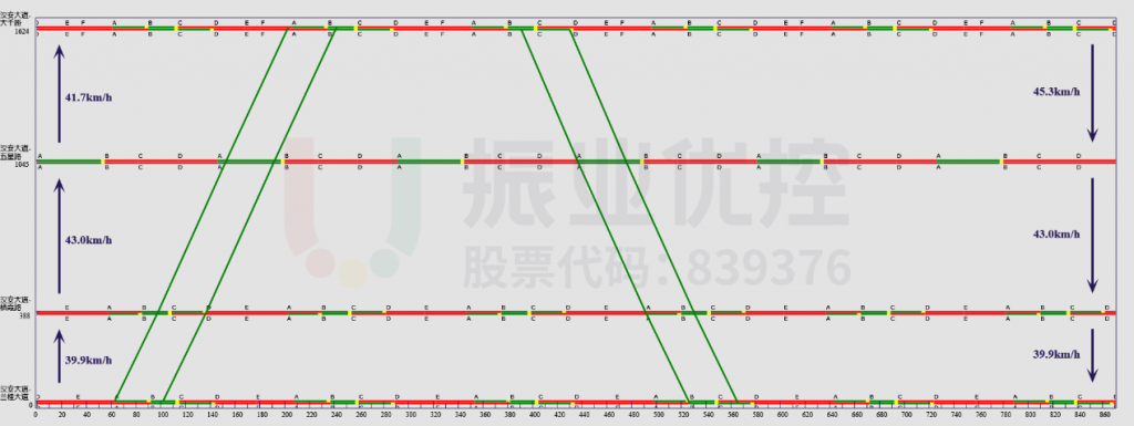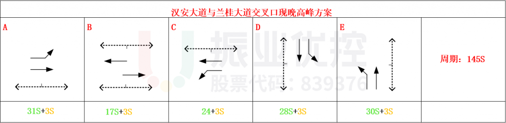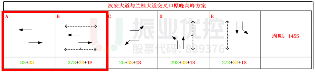 以漢安大道與蘭桂大道交叉口作為關(guān)鍵路口,設(shè)計(jì)漢安大道與蘭桂大道至漢安大道與大千路4個(gè)交叉口的雙向綠波,根據(jù)實(shí)際流量流向特征,調(diào)整各交叉口相位相序,使車輛在協(xié)調(diào)路段上連續(xù)通過各個(gè)交叉口的時(shí)間最大化。