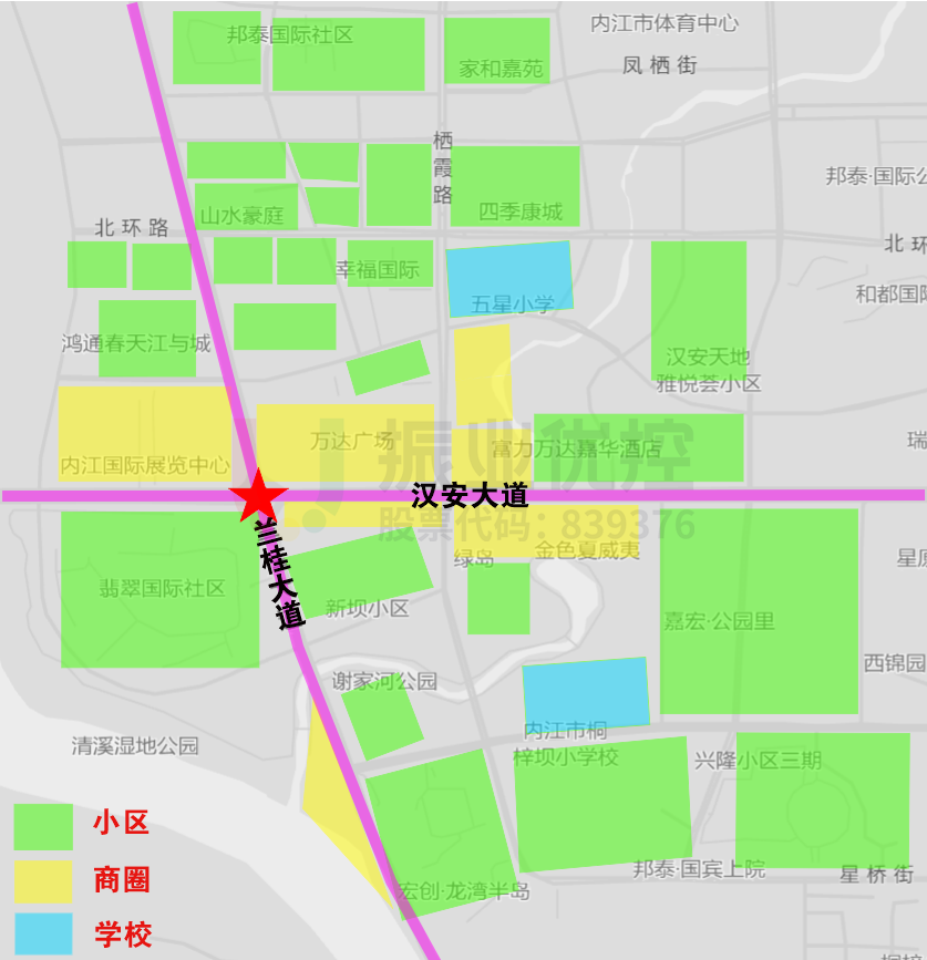 漢安大道與蘭桂大道交叉口位于城市核心區(qū)西端,是漢安大道與蘭桂大道兩條城市主干道的交通轉(zhuǎn)換節(jié)點(diǎn),周邊業(yè)態(tài)復(fù)雜、商住集中,交通吸引點(diǎn)繁多,緊鄰萬達(dá)廣場、龍灣半島、內(nèi)江會(huì)展中心等大型商業(yè)活動(dòng)中心;500米半徑內(nèi)集中了近20個(gè)住宅小區(qū),同時(shí)學(xué)校、醫(yī)院、市場等配套建設(shè)較為成熟,區(qū)域路網(wǎng)及主次干道既承擔(dān)通過性交通功能,也符合生活性(到發(fā)性)交通特征,路網(wǎng)以各功能區(qū)為中心的向心交通、潮汐交通現(xiàn)象較為突出。