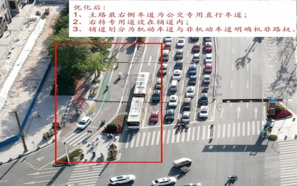 將西進(jìn)口輔道設(shè)置為機(jī)動(dòng)車與兩三輪車右轉(zhuǎn)通道,通過實(shí)線劃分車道,再將主路最右側(cè)車道改為直行車道,右轉(zhuǎn)前置,促使車輛提前進(jìn)入輔道進(jìn)行右轉(zhuǎn);并偏移南出口道護(hù)欄,增加50厘米行駛空間,使交叉口流向更加統(tǒng)一、順暢。