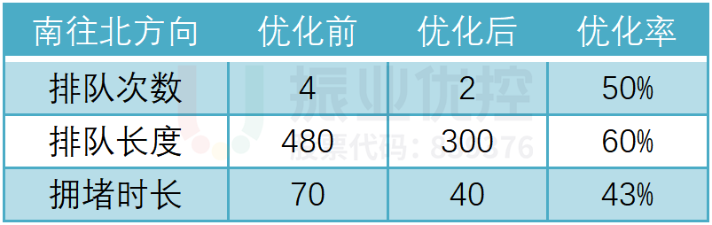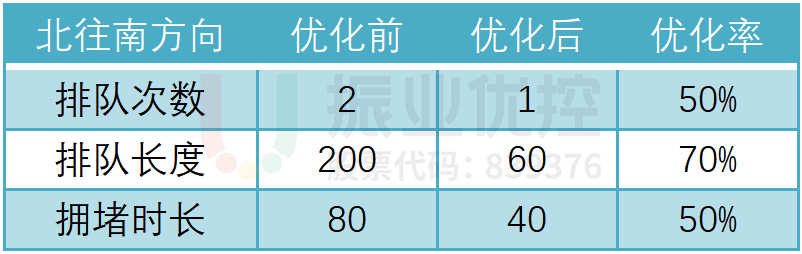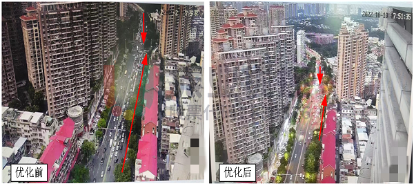 經(jīng)優(yōu)化,路口擁堵時(shí)長(zhǎng)由原本70分鐘減少為40分鐘,排隊(duì)次數(shù)由4次減少為2次,排隊(duì)長(zhǎng)度也有明顯的下降。