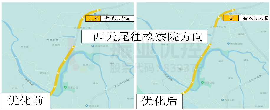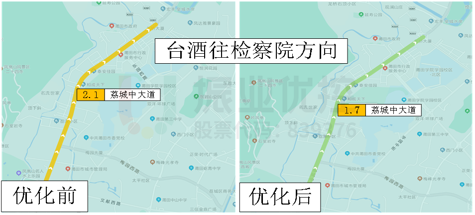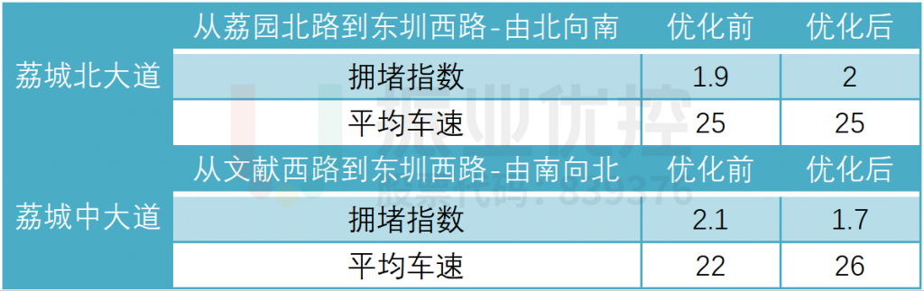 另外,從高德數(shù)據(jù)可得,進(jìn)行紅波截流和綠波疏導(dǎo)后,荔城大道(南往北方向)路段擁堵指數(shù)由2.1降低至1.7,達(dá)到疏導(dǎo)的效果;荔城大道(北往南方向)路段擁堵指數(shù)由1.9上升為2,起到截流效果。
