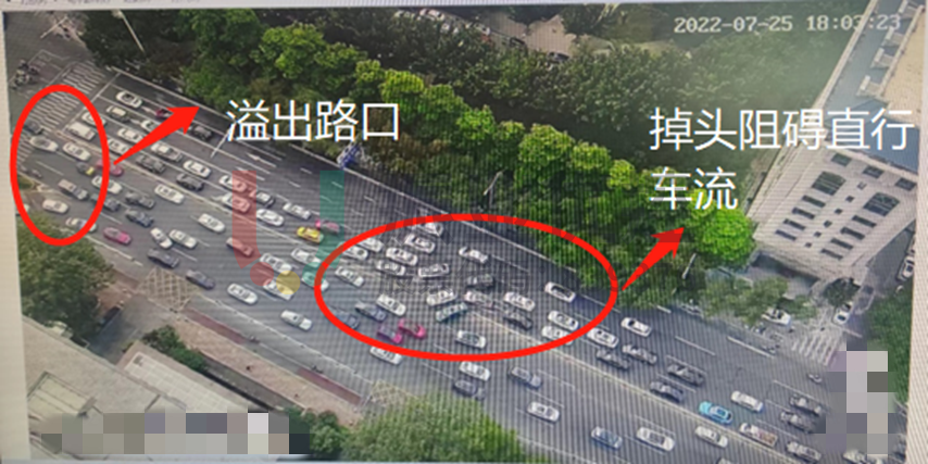 (2)檢察院路口(市政府往檢察院方向)通行效率低、排隊(duì)較長(zhǎng)、容易溢出到市政府路口;另外掉頭車流阻礙直行車流,影響行車效率。
