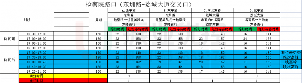 (2)對(duì)溪南路口采用重復(fù)放行方式提高南北直行的綠信比,減少回溢現(xiàn)象;并將路口晚高峰方案由一套方案精細(xì)化為四個(gè)時(shí)段方案,提高路口通行效率。