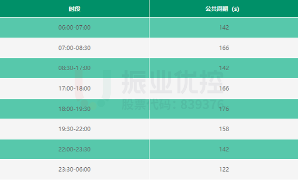 以西門路口為重要節(jié)點(diǎn)路口,根據(jù)西門路口方案周期及路段流量情況,確定此路段綠波協(xié)調(diào)的公共周期及時(shí)段表,如下表所示: