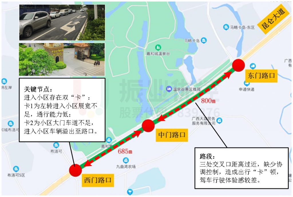 昆侖大道-嘉和城西門、中門、東門路口均為昆侖大道進(jìn)出嘉和城溫泉谷小區(qū)的T型路口,其中,西門路口是該小區(qū)居民出行的重要節(jié)點(diǎn)路口之一,晚高峰時(shí)段,車流量大,擁堵問(wèn)題較為嚴(yán)重。