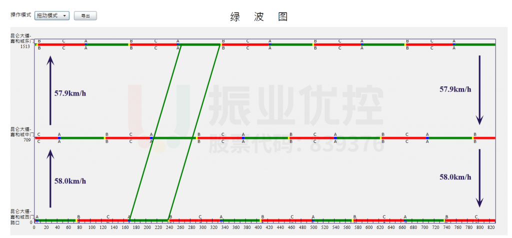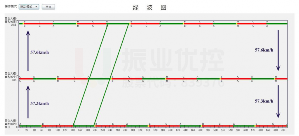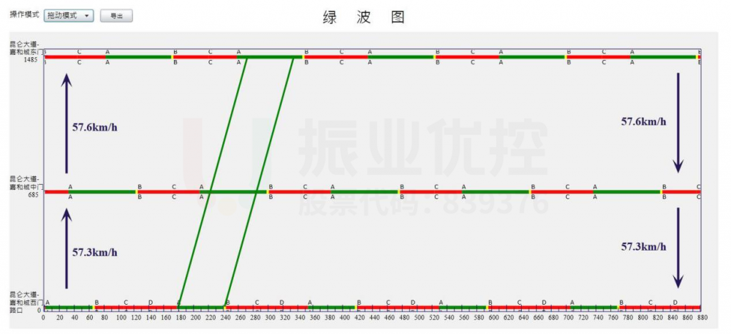 經(jīng)過(guò)實(shí)地調(diào)研車道數(shù)量、車輛類型占比及道路限速60km/h等數(shù)據(jù),在保障路段通行安全的情況下,設(shè)計(jì)該協(xié)調(diào)路段全天時(shí)段平均車速為55±3km/h。