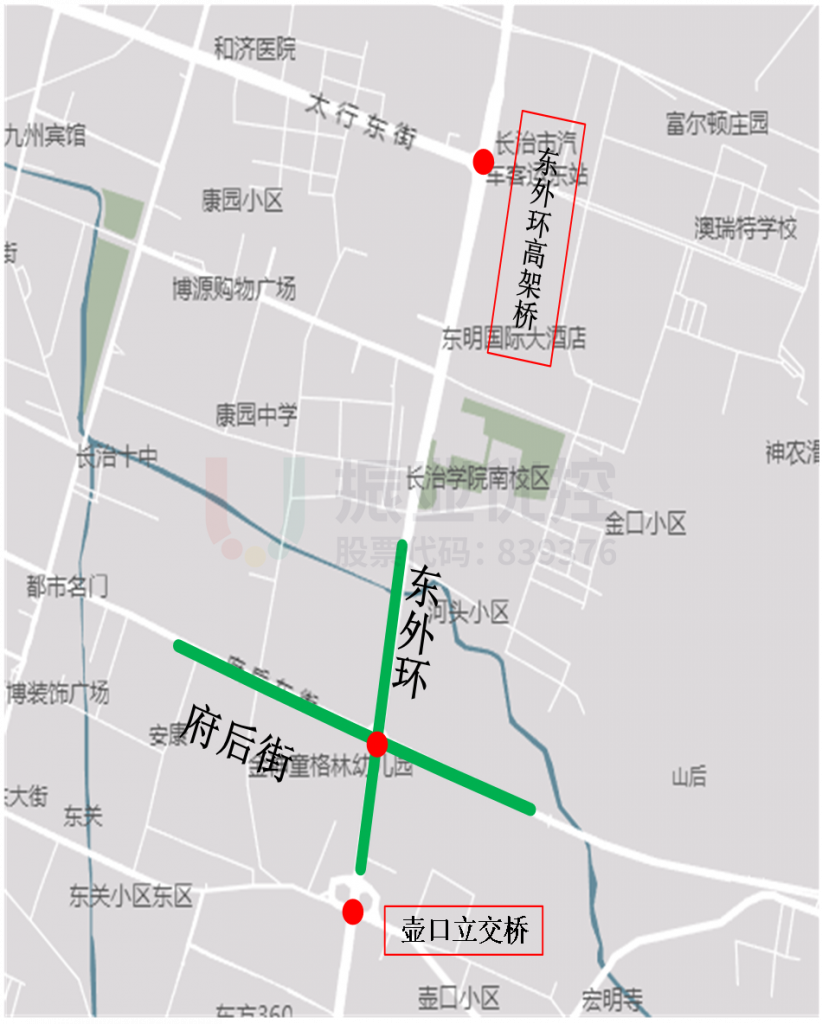 府后街-東外環(huán)路口由東西走向的府后街與南北走向的東外環(huán)十字相交而成。該路口往南可達(dá)壺口立交橋,以北連接新建的東外環(huán)高架橋,東外環(huán)作為長治市最東側(cè)貫穿南北方向的主干道承載著大量的車輛通行需求。