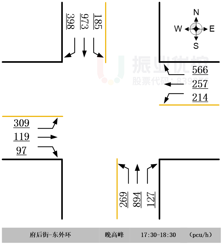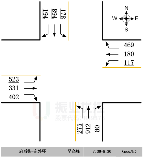 路口主要車流為南北直行為主,東進(jìn)口以右轉(zhuǎn)車流為主,西進(jìn)口以左轉(zhuǎn)車流為主。
