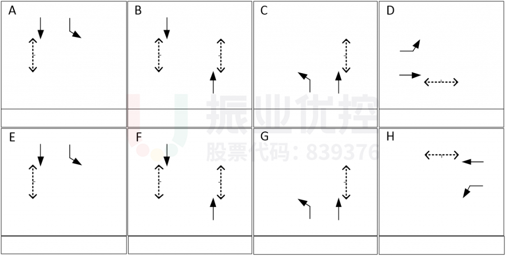 優(yōu)化前路口渠化如圖2所示,放行相位如圖3所示,其中為保障南北干道車輛通行,南北雙向直行相位所占綠信比較大。