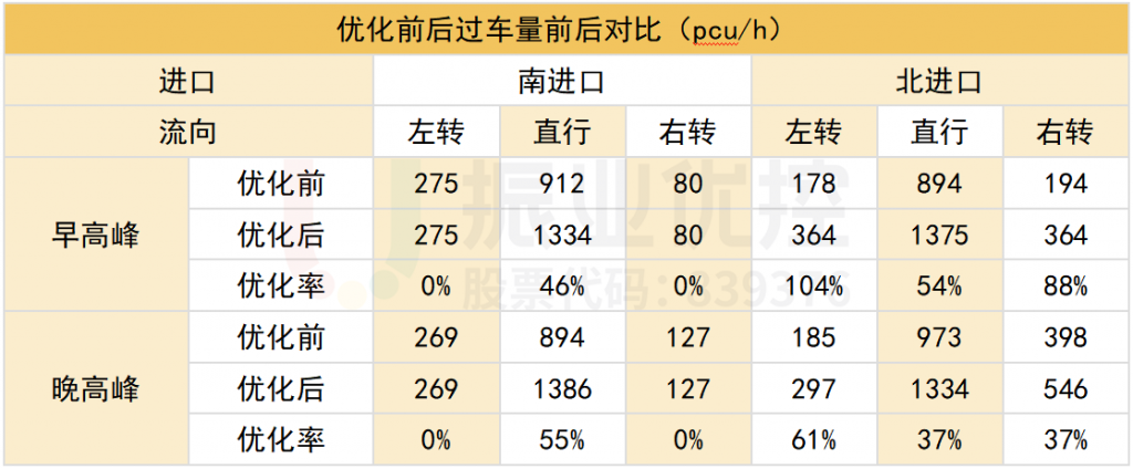 優(yōu)化后,路口整體通行效率明顯增加,排隊(duì)長度減少。其中,南北方向二次放行車道利用率增加、車輛等待時(shí)間減少,右轉(zhuǎn)車輛通行效率提高;東西方向通行情況與優(yōu)化前基本一致。