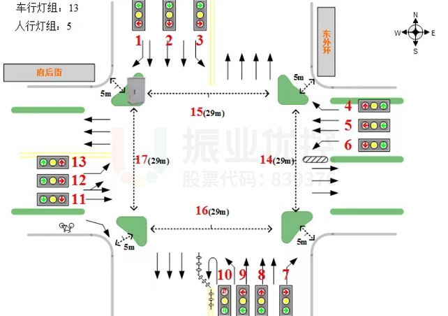 (5)由于南北進(jìn)口斑馬線均有29m,為保障行人過街時(shí)間,東、西進(jìn)口放行時(shí)間無法壓縮。