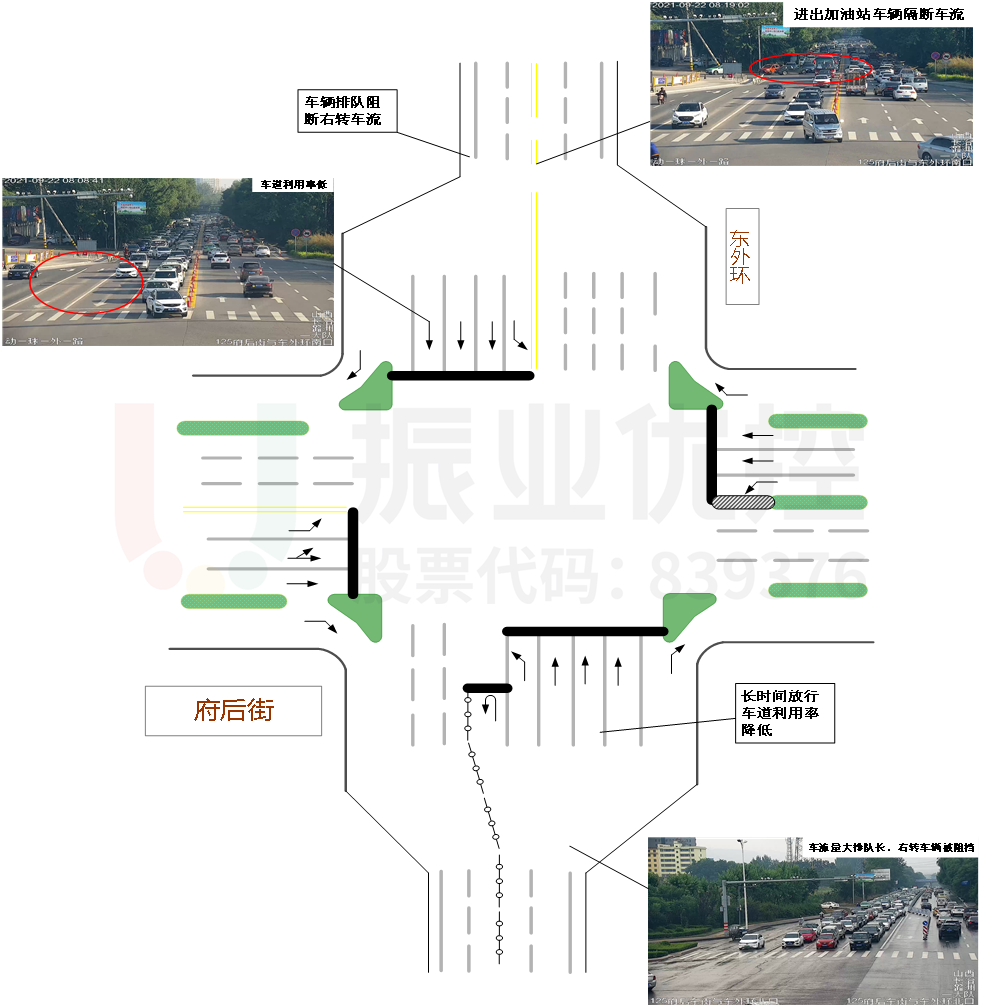 (1)路口主要車流方向?yàn)槲?、北、南進(jìn)口,其中南北方向車流出現(xiàn)溢出到上游路口的現(xiàn)象。