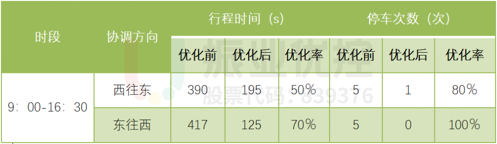 經(jīng)優(yōu)化升級后,世紀(jì)大道(協(xié)調(diào)路段)東西雙向的車輛停車次數(shù)、行程時(shí)間顯著降低,具體數(shù)據(jù)見下表: