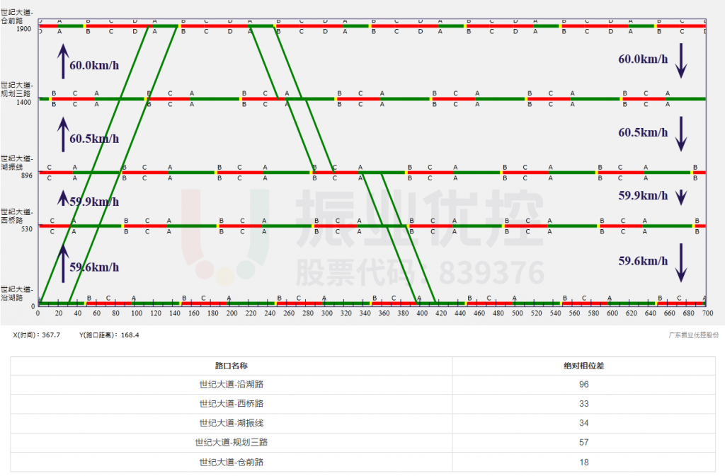 世紀(jì)大道(協(xié)調(diào)路段)設(shè)計(jì)東西雙向協(xié)調(diào)方案,設(shè)計(jì)速度為60km/h,東往西不停車通過,西往東停車1次。