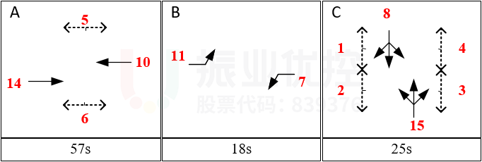 在完善相關(guān)路口標(biāo)志標(biāo)線基礎(chǔ)上,重新設(shè)計(jì)世紀(jì)大道-湖振線路口的放行相位,減少車車干擾造成綠燈時(shí)間的浪費(fèi),同時(shí)統(tǒng)一各個(gè)路口的周期為100s。