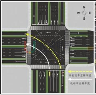 方案特點:左轉(zhuǎn)非機動車可以在路口直接左轉(zhuǎn),符合駕駛習(xí)慣,通行體驗感較好;對信號控制方案限制較大,信控方案需為對向直行、對向左轉(zhuǎn)控制模式,以保障左轉(zhuǎn)非機動車通行。若無法使用該放行方式,需單獨設(shè)置左轉(zhuǎn)非機動車通行相位,對機動車通行有一定影響。