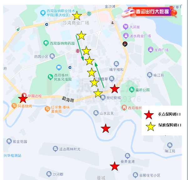 勐泐大道從版納大廈至南站路段全日實行雙向綠波方案,提升通行效率;對勐海路沿線的壩吉路口、南站路口、民航路口、機場公路口、曼聽路口進行預(yù)案設(shè)置,增加勐海路配時,優(yōu)先車流通行;對勐泐大道南段的會展路口、曼弄楓路口進行全時段優(yōu)化,調(diào)整平峰配時160s,高峰170秒,保障路口通行順暢。