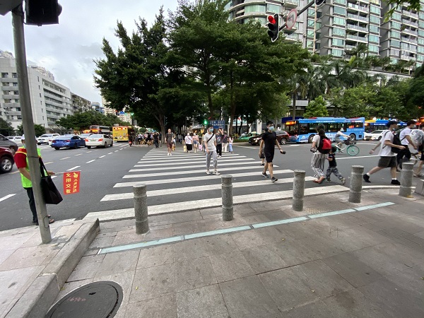 同時斑馬線的寬度與過街行人數(shù)及信號顯示時間相關(guān),順延主干路的斑馬線寬度不宜小于5m,順延其他等級道路的斑馬線寬度不宜小于3m,以1m為單位增減。斑馬線長度超過16m時(不包括非機動車道),應(yīng)在斑馬線中央規(guī)劃設(shè)置行人過街安全島。