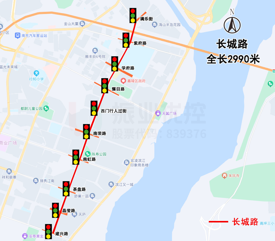 長(zhǎng)城路是南充嘉陵主城區(qū)南北方向的主要干道之一,沿線(xiàn)分布著眾多學(xué)校(嘉陵南高、光彩實(shí)驗(yàn)小學(xué))、住宅區(qū)(泥溪口小區(qū)、源泉小區(qū)等)、市場(chǎng)商圈(光彩大市場(chǎng)、保利購(gòu)物中心)、公園(陳壽公園)等主要交通吸引點(diǎn),道路日常承擔(dān)著巨大的通行壓力。路段全長(zhǎng)2.9公里,共涉及10個(gè)信號(hào)燈路口,早晚高峰南北直行車(chē)流量較大。
