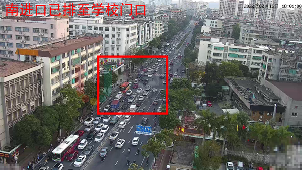 汕樟-金湖路口位于金砂小學(xué)附近,晚高峰放學(xué)時(shí)段,南進(jìn)口車流量激增,排隊(duì)車流回溢至學(xué)校門口,阻擋學(xué)生“放學(xué)路”,出現(xiàn)安全隱患。