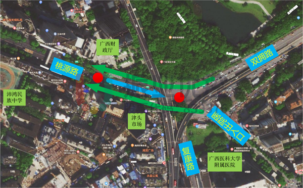 桃源路-財政廳門前路口與桃源路-雙擁路路口間距約130米,桃源路-財政廳門前路口附近有南寧市沛鴻中學(xué)、津頭市場,為保障通行安全,工作日高峰期(07:00-08:10)(17:50-19:00)時段人流量、車流量較大,開啟紅綠燈控制;其余時段為黃閃控制。