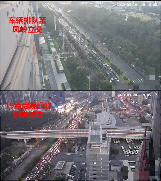 (1)工作日晚高峰時段由西進(jìn)口左轉(zhuǎn)至鳳嶺片區(qū)方向車流量大,車輛排隊接近鳳嶺立交,擁堵嚴(yán)重。