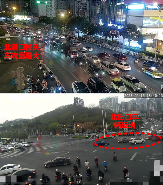 (2)隨著路口東北角新建成商場開業(yè),北進(jìn)口方向出行車流明顯增加,但因東右轉(zhuǎn)進(jìn)城車輛不受信號燈控制,與西左轉(zhuǎn)、北掉頭車輛出現(xiàn)明顯沖突,加劇路口擁堵。