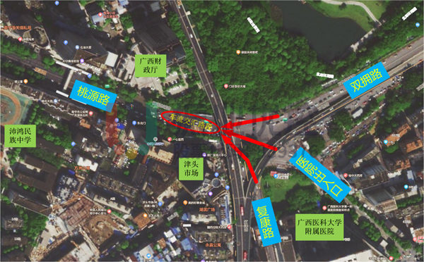 民族大道-楓林路路口是南寧市主要進(jìn)出城關(guān)鍵路口,東靠近東城區(qū)高速出入口,往北可達(dá)鳳嶺片區(qū)和火車東站,周邊有客運站和商場,日常車流吸引力較大。
