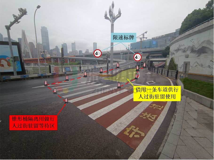千廝門(mén)大橋北橋頭作為江邊觀景人流主要集散點(diǎn),行人通行需求較為突出,本次借用車道供行人通行,提升游客過(guò)街安全,也為游客乘坐軌道交通提供便利,實(shí)現(xiàn)了人車分離,突出了重慶交警人性化和科學(xué)化交通管理,展示了“火鍋城市”的熱情。