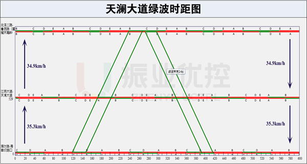 通過(guò)對(duì)片區(qū)內(nèi)道路進(jìn)行充分調(diào)研,獲取片區(qū)主通行流向情況,綜合考慮選取鳳瀾路-江溉大道作為基點(diǎn)路口,統(tǒng)一周期為120s,對(duì)鳳瀾路、江溉大道、天瀾大道三條主要道路進(jìn)行平峰綠波協(xié)調(diào)控制,提高交通流的連續(xù)性,減少車輛在路口的停車次數(shù),提升車輛平均行駛速度,實(shí)現(xiàn)區(qū)域路網(wǎng)交通流均衡。