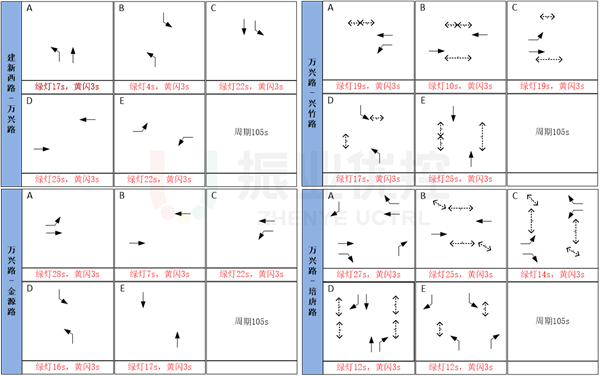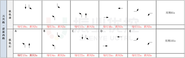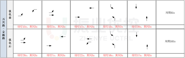 優(yōu)化路口相位相序。對萬興路-建新西路、萬興路-金源路兩個路口的相位相序進行調整,保證單個路口正常運行的情況下,提高路段協(xié)調控制效果。
