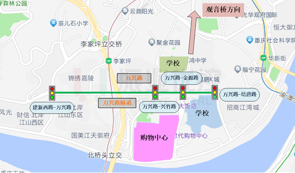 萬興路位于重慶市江北區(qū),全長約2.2公里,東向連接華福路,西向連接建新西路,是渝澳片區(qū)東西走向的主要通道。周邊分布有居民小區(qū)、學校、酒店、購物中心等交通吸引點,日常交通通行需求較大。